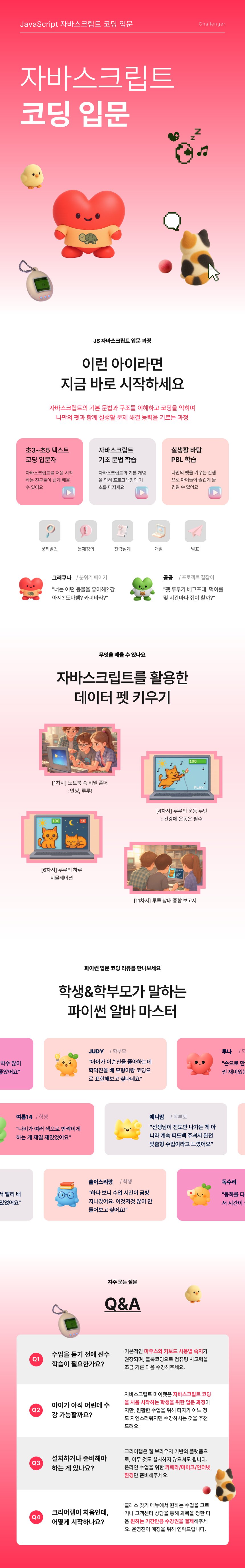 A. 자바스크립트는 결과가 웹 브라우저에 바로 나타나기 때문에 아이들이 훨씬 시각적이고 재미있어합니다. 크리어랩의 초등 코딩 수업은 고학년 눈높이에 맞춰 '루루 키우기'라는 친숙한 설정으로 진행되어 누구나 즐겁게 따라올 수 있습니다.